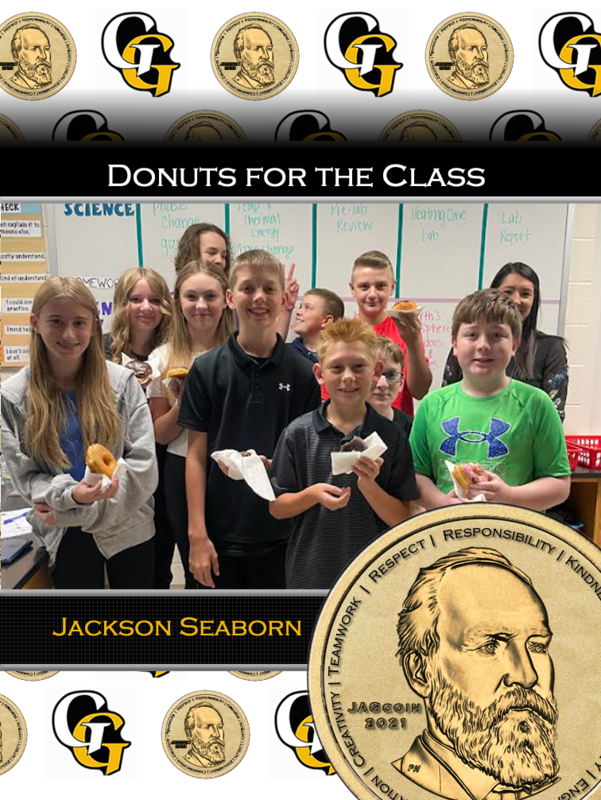 Congratulations to our newest JAGcoin Raffle winner Jackson! Jackson won Donuts 4 the Class during Mrs. Giammo's Science Class this week from Dunkin Donuts. Fun fact, his sister won the same raffle last year and also picked science class. Keep up the great work in demonstrating our District's Core Values, Jackson! It's a great time to be a G-Man. Go G-Men!